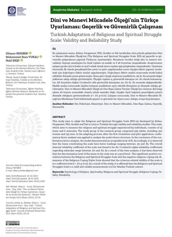 Fakültemiz Araştırma Görevlisi Dilanur Rehber'in “Dini ve Manevi Mücade Ölçeği'nin Türkçe Uyarlaması: Geçerlilik ve Güvenirlik Çalışması” adlı araştırma makalesi İlahiyat Tetkikleri Dergisi’nde yayınlanmıştır. Hocamızı tebrik eder, başarılarının devamını dileriz.