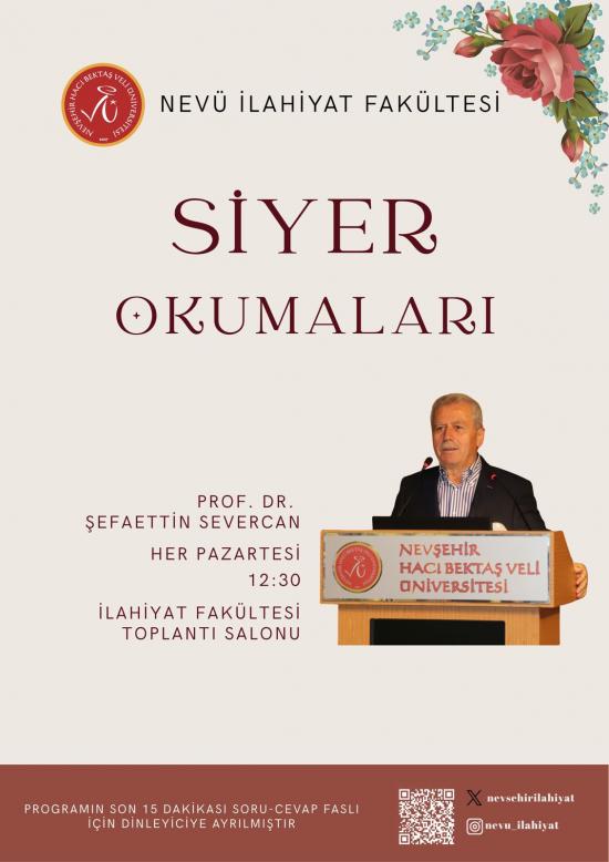 Nevşehir Hacı Bektaş Veli Üniversitesi İlahiyat Fakültesi tarafından, Prof. Dr. Şefaettin Severcan hocamızın yürütücülüğünde “Siyer Okumaları Semineri” düzenlenecektir.